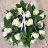 Большая корзина из белых роз и зелени является признаком особого статуса. Такой подарок обычно дарят на свадьбу или юбилей важному человеку.